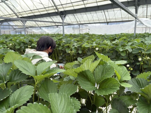 イチゴの成長のために必要な日光が当たるように余分な葉っぱを切っていくお仕事です。