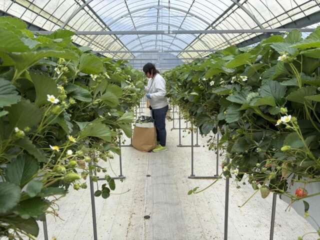 イチゴの成長のために必要な日光が当たるように余分な葉っぱを切っていくお仕事です。