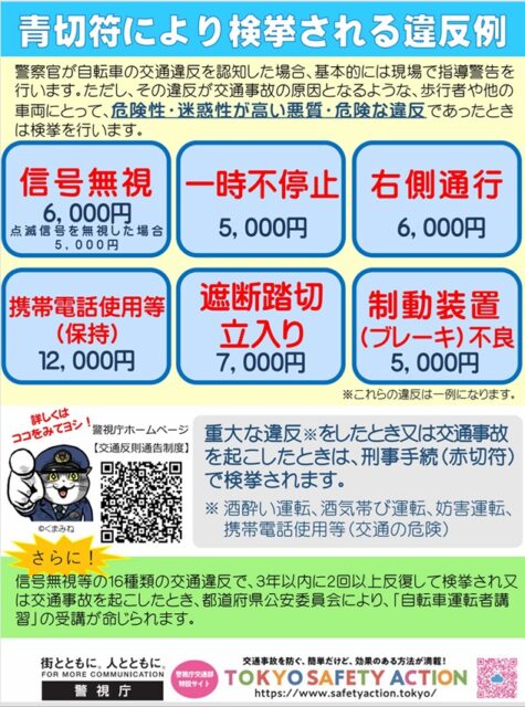 青切符とは、交通反則通告制度に基づいて交付される「交通反則告知書」を指し、自転車の一定の交通違反に対して反則金を納付することで違反処理を終わらせる制度です。